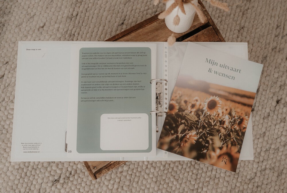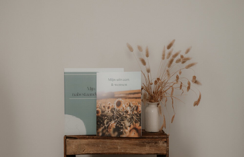 Het leven kent geen garanties, maar wat je wél kunt doen, is je nabestaanden voorbereiden op het moment dat jij er niet meer bent. De Mijn Nabestaandenmap en het bijbehorende invulboek voor uitvaartwensen helpen je om alles overzichtelijk en liefdevol vast te leggen — van financiële zaken tot je laatste wensen.